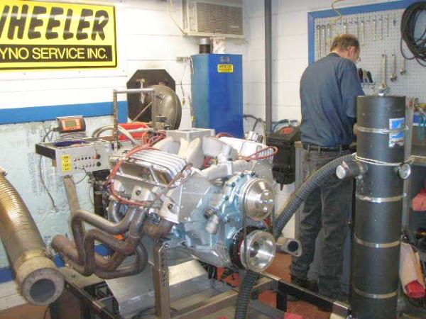 We carted the new engine over to Wheeler Dyno Service in Anoka County Mn this morning and broke her in. This is the same Wheeler Dyno that gets written up in Pontiac Mag from time to time. The first run at 34 Degrees timing and lean jetting we got 579 HP and around 600 ft lbs of torque. I thought it can't get any better than this. Moving up to 37 degrees and up several jet sizes, we ended the session at 590 HP and 610 Ft Lbs. It was running 550 Lbs torque at 3000 rpm, for gods sake and it still had 535 Ft Lbs when it reached the end of its run at 5800 RPM. The HP stayed flat at 587 to 590 from 5400 to 5800 RPM's. The worked over Speed Demon 750 with an estimated actual flow of 850 was played out, driving the vacuum to -1.1, so we could have kept searching for more with a larger carb, but this is the way it's going into the car. This was done on Clear 91 octain pump gas which I brought along in a 5 gallon can.